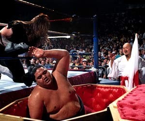 Mankind est assommé en contrebas ! Mankind aussi connu sous le nom de Mike Foley n’est pas du genre à passer inaperçu. À l’époque, il est complètement fou et sa folie le mène à pourrir les matchs de l’Undertaker. Cette nouvelle passion va nous donner une superbe rivalité qui va conduire les hommes à se battre partout où ils se croisent. À Summerslam, un match dans la chaufferie du stade (Boiler Room Match) est organisé. À la surprise générale, Paul Bearer trahit son protégé et lui assène un coup avec l’urne pour offrir la victoire à Mankind. La rivalité monte alors d’un cran et un match enterré vivant est organisé. L’Undertaker place un chokeslam destructeur sur Mankind pour le placer dans le cercueil mais l’Executioner arrive avec d’autres superstars pour enterrer le Deadman. Mais le destin de l’Undertaker est de toujours se relever : ainsi, il reprend sa rivalité avec Mankind. Ce dernier lui propose un accord à l’amiable dans un match où Paul Bearer est le cadeau. Le dit cadeau est placé au dessus du ring et le vainqueur est libre de lui faire ce qu’il veut. Le Deadman gagne le match mais l’Executioner sauve la vie de Bearer et gagne le droit de prendre une rouste des mains de l’Undertaker. Il va alors tourner son regard sur le nouveau protégé de Bearer, Vader. Cette rivalité va le conduire dans des matchs de championnats aux côtés de Steve Austin et de Bret Hart. Finalement, il gagnera le titre pour la seconde fois et enchaînera une autre victoire à Wrestlemania XIII en battant Sycho Sid.