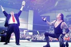 Sympa les gants assortis à la cravate ! Cependant, ce transfert ne signifie pas du repos puisqu’il va immédiatement entrer en rivalité avec Brock Lesnar. Seule la fracture d’une de ses mains va l’empêcher de remporter le match. Le Big Show va en profiter dans les jours suivants pour s’en prendre à lui. Ainsi, à son retour, il cible le géant et il parvient à le vaincre grâce à une soumission. Néanmoins, A-Train (Lord Tensai) en profite pour se mêler à la rivalité. L’arrivée de Nathan Jones va sauver le Phenom qui va le prendre sous son aile. Tout doit se régler à Wrestlemania XIX dans un match par équipe mais au dernier moment, Jones est enlevé du match et l’Undertaker est seul contre deux. Néanmoins, Nathan n’est pas un piètre ami puisqu’il va parvenir à aider son mentor à vaincre la colossale équipe. Suite à cette victoire, le Phenom va tenter de gagner le titre à deux reprises mais le sort s’acharne contre lui. En l’occurrence, le destin s’appelle Mac Mahon. Ce dernier a pourri le match entre l’Undertaker et Lesnar. Ainsi le Phenom doit affronter Mac Mahon dans un match où il faut enterrer l’autre vivant. Alors que personne ne s’y attendait, Kane arrive et trahit son frère une fois de plus. Kane ensuite déclare que son frère est enterré à jamais.