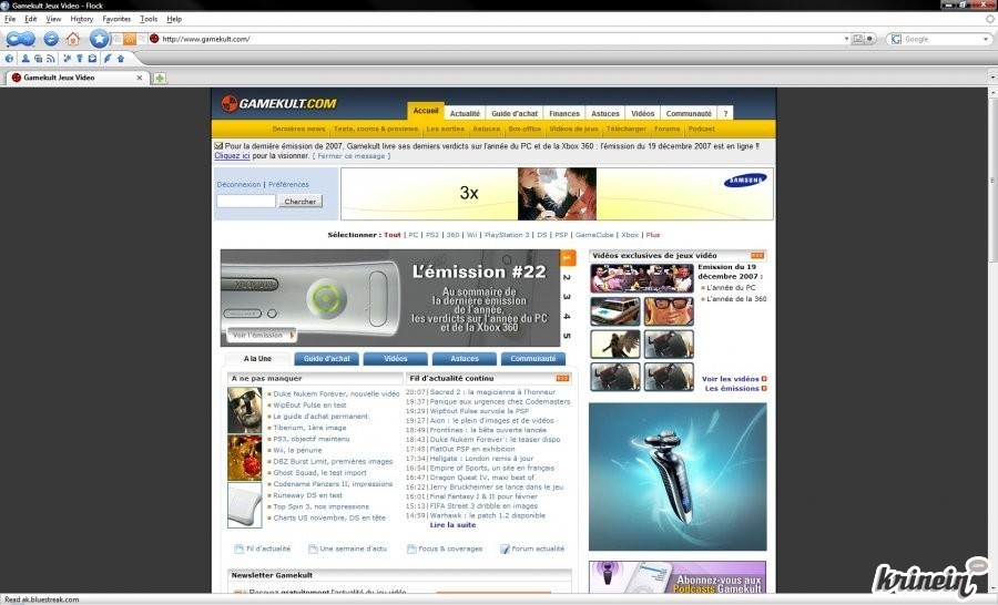Des vidéos (ici l'émission)Avec le temps, Gamekult s'est étoffé. Les vidéos ont pris place sur le site, offrant à la fois les classiques trailers officiels comme des vidéos capturées par leurs soins, ce qui est souvent bien plus représentatif du contenu du jeu. Celles-ci étaient réservées dans un premier temps aux membres Premium, c'est-à-dire les abonnés du site, qui bénéficient de quelques services supplémentaires (téléchargement de vidéos, forum privé, suppression des publicités, etc.). Ce service a été rendu accessible à tous, avec l'arrivée du player flash, permettant à n'importe quel visiteur de visionner les vidéos directement sur le site. Le téléchargement reste cependant exclusif aux abonnés, ce qui constitue, à mon goût, un bien piètre avantage. La qualité proposée sur le player flash est bien suffisante et les vidéos exclusives sont rarement de celles que l'on va visionner plusieurs fois, ailleurs que sur le site. A noter que l'accès aux archives était lui aussi réservé aux abonnés, restriction qui aura été levée en même temps que celle qui concernait les vidéos.
